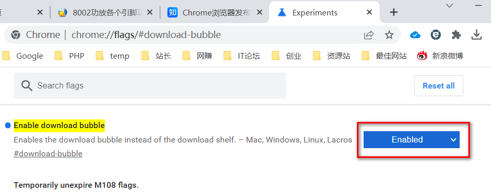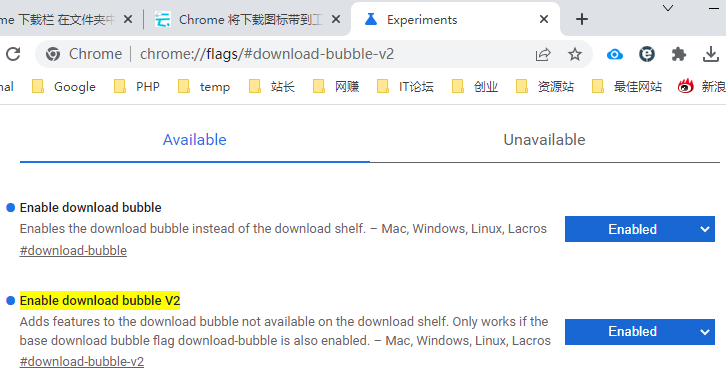 chrome://flags/#download-bubble-v2,将默认的Default改为Enabled,表示在下载工具栏中显示打开文件夹与打开 工具栏。