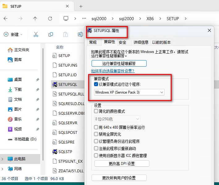 安装目录中找到X86\SETUP\SETUPSQL.EXE右键属性更改兼容性为“Windows XP(Service Pack 3)”: