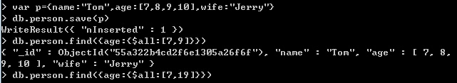 Note:$all匹配所有,类似t-sql中的in,但是t-sql中的in是满足括号里面的任何一个都能出数据,而mongodb中的$all则必须满足[]中的所有值。