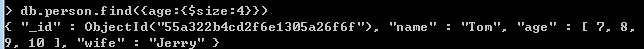 1、{age:{$size:4}}:age数组元素个数为4的数据结果集。